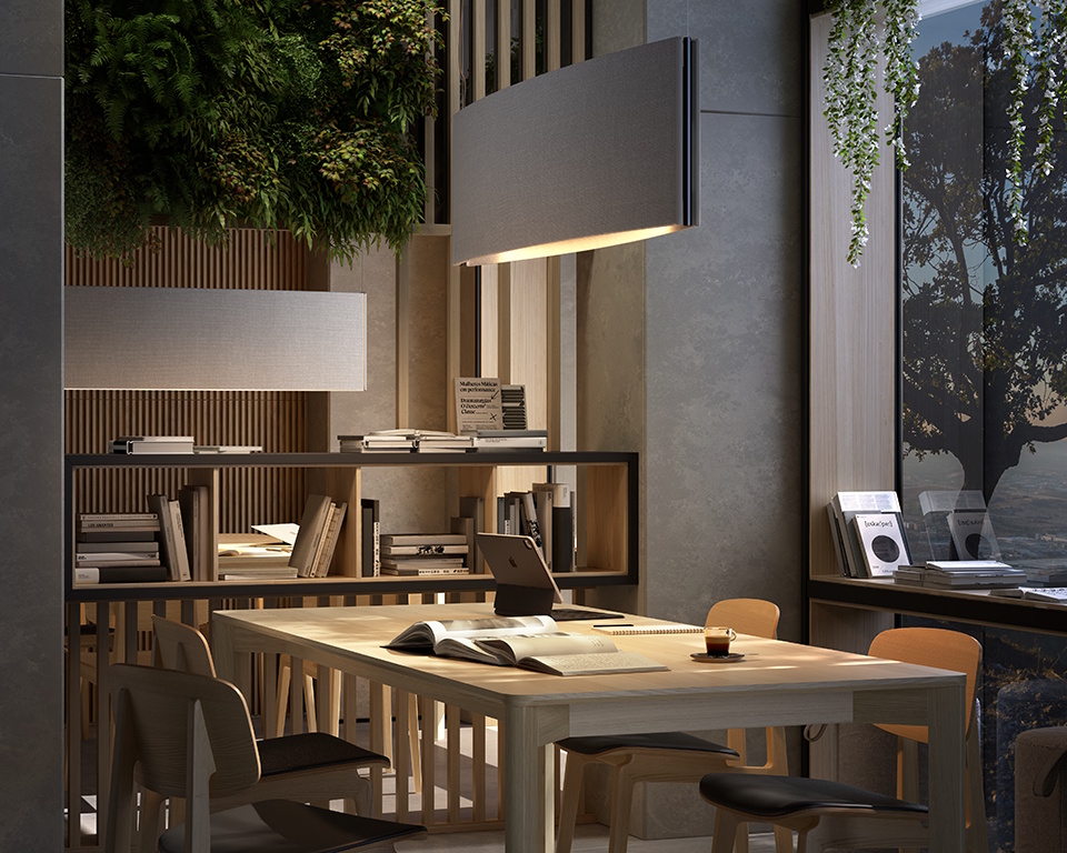 Noren S/151 LED 22,5W 975lm 3000K CRI>95 60°, hämardatav DALI, alla valgusega rippvalgusti, terrakota, heli summutav materjal